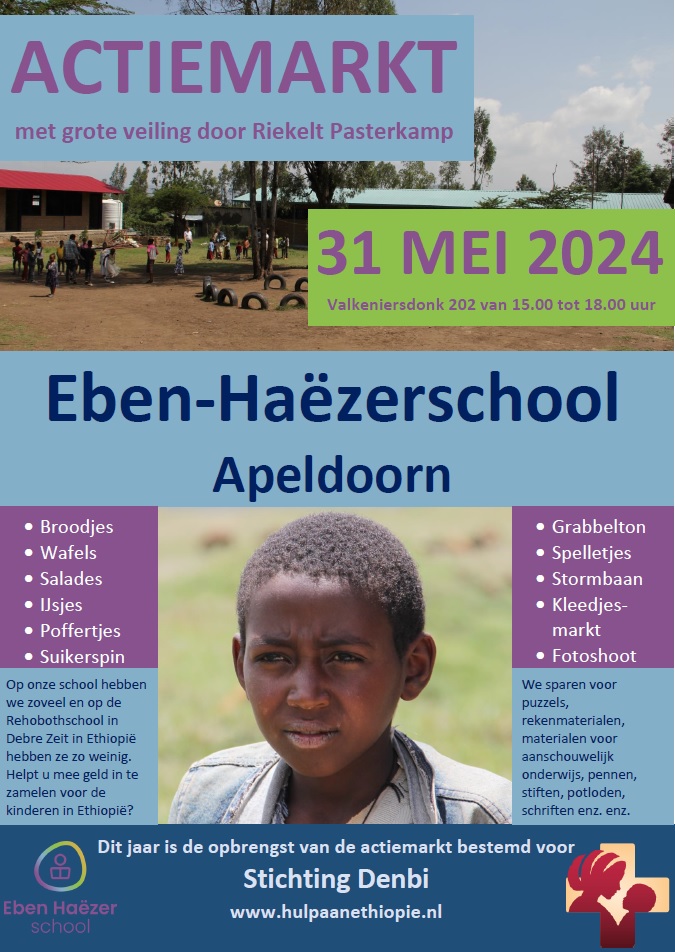 Stichting Denbi onderhoudt een kliniek voor moeder- en kindzorg in een dorpje in Ethiopië. De zorg is bestemd voor de allerarmsten in het dorpje Denbi. Tevens proberen de medewerkers Gods Woord aan de Ethiopiërs in woorden en daden door te geven. Stichting Denbi is enkele jaren geleden in contact gekomen met Emebet. Emebet is een gedreven vrouw die de nood in haar omgeving zag en vanuit eigen middelen een klein schooltje is begonnen. Het ideaal van Emebet was de kinderen te onderwijzen en hen het evangelie vanuit Gods Woord door te geven. Emebet met een adviseur. Op het schooltje kwamen kinderen die normaal gesproken niet naar school zouden kunnen. Stichting Denbi heeft toentertijd een sponsorprogramma opgezet. Nederlandse mensen sponsoren een kind dat daardoor naar school kan gaan en tussen de middag een warme maaltijd ontvangt. Voor veel van de kinderen is dit de enige maaltijd die ze op een dag krijgen. Stichting Denbi heeft de afgelopen jaren nieuwe lokalen, schoolkleding en een overdekte eetzaal gefinancierd. Wij hebben op onze scholen heel veel materialen. Op de school in Ethiopië hebben ze inmiddels wat lesboeken, maar verder is er aan alles gebrek. Daarom lijkt het ons als schoolteam heel mooi om voor de kinderen in Ethiopië geld op te halen zodat er goede schoolmaterialen, zoals aanschouwelijk lesmateriaal kan worden aangeschaft!
